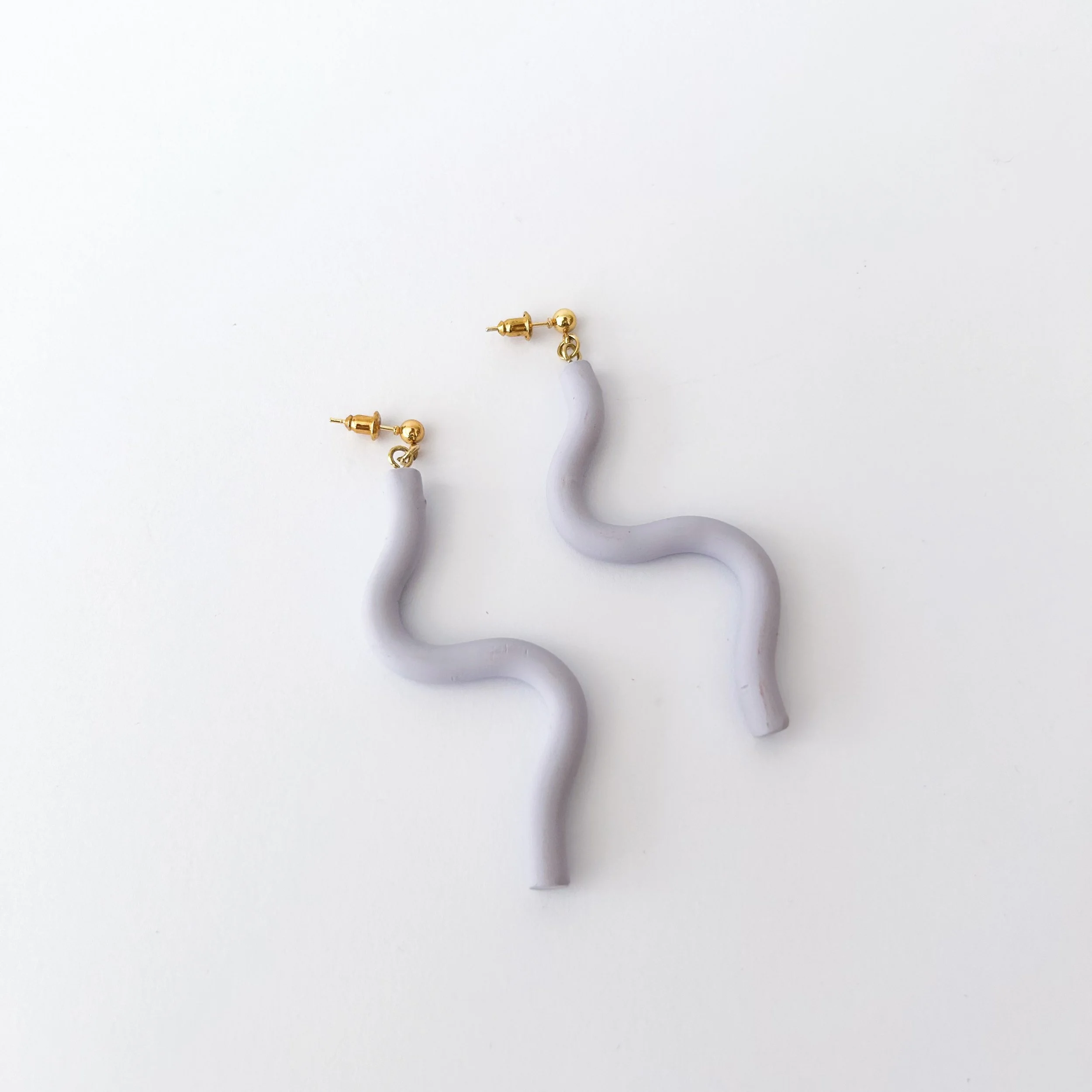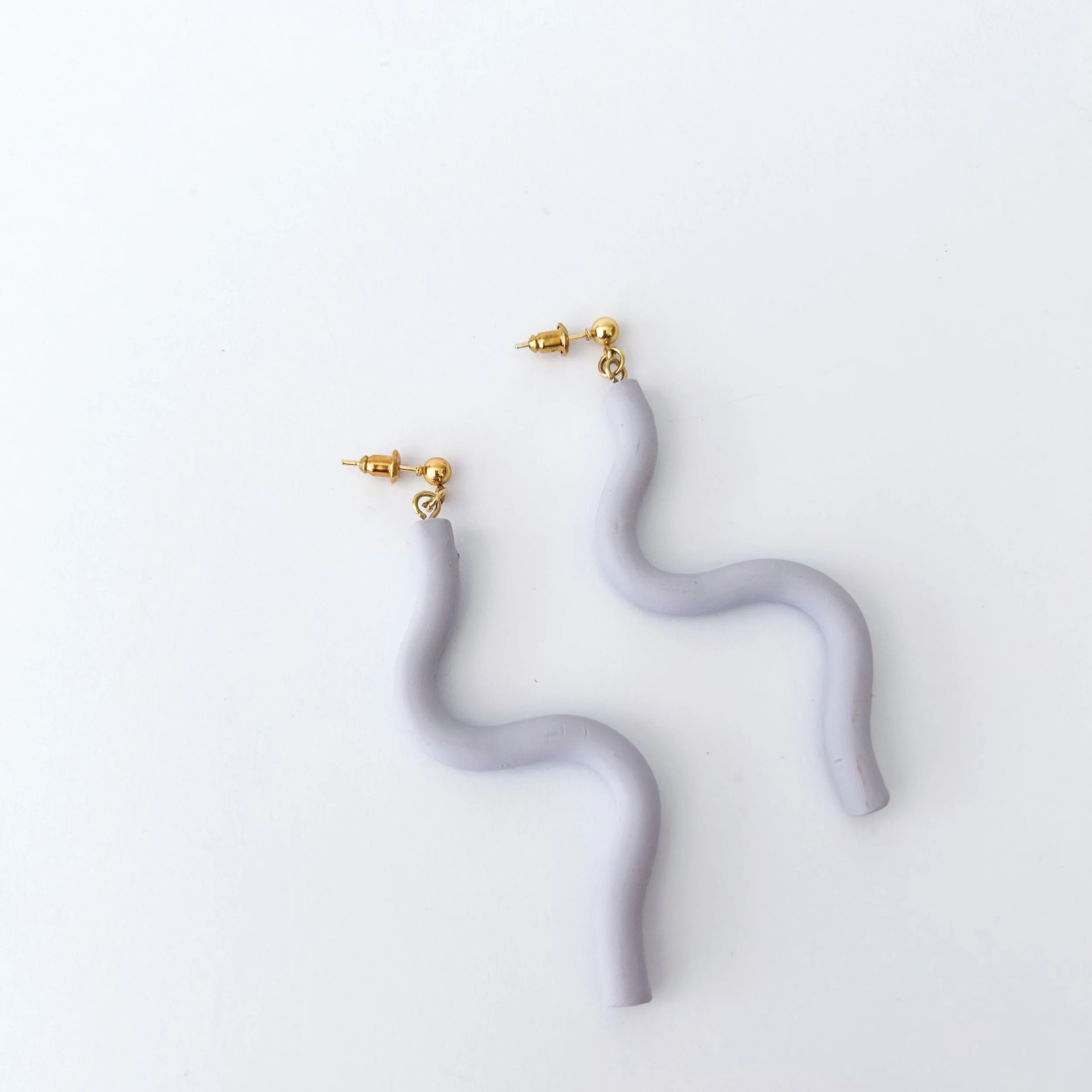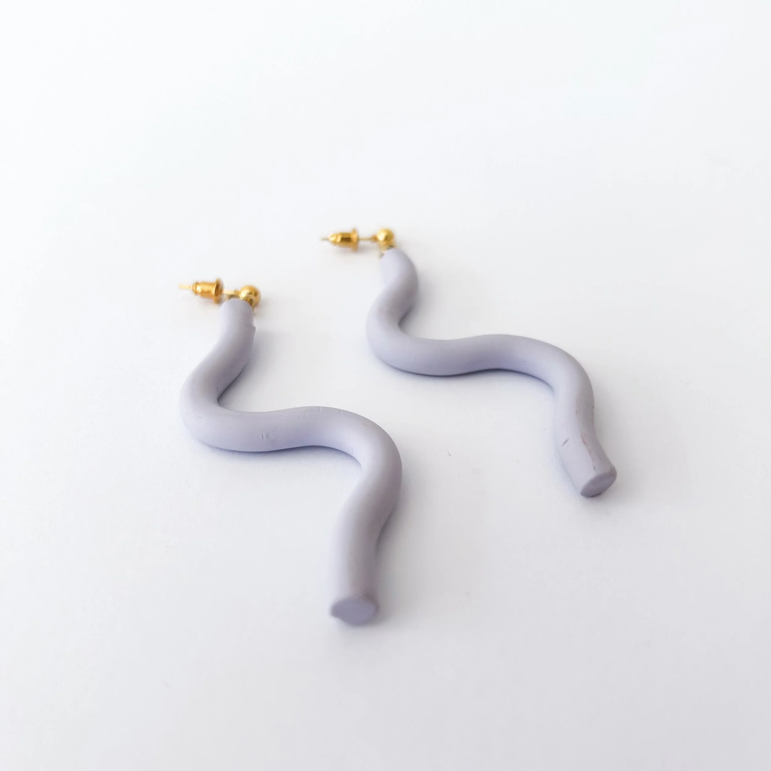 These playful wiggles add some flair to any outfit. Made with polymer clay, and finished with a gold plated post. Seconds - lightly marked and some air bubbles in clay.
